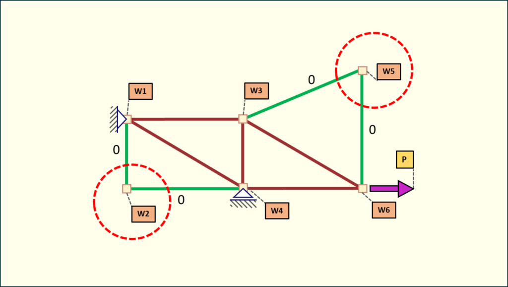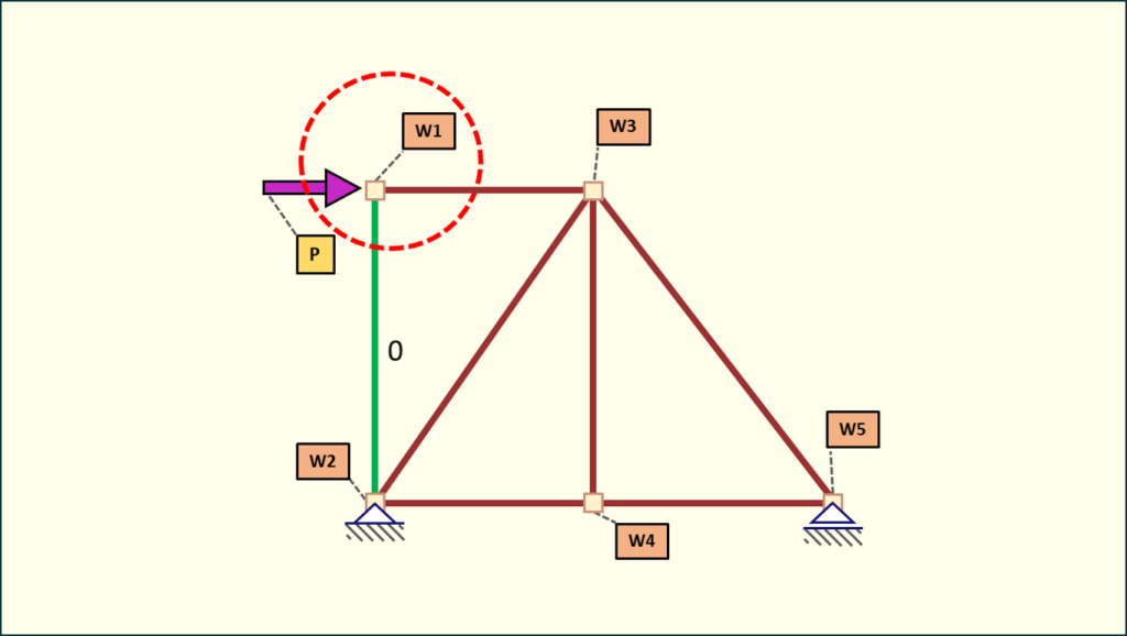 Jeżeli mamy dwa pręty połączone węzłem (pod dowolnym kątem) i węzeł ten jest obciążony siłą, która jest w tej samej linii co jeden z prętów, wtedy drugi pręt jest zerowy.