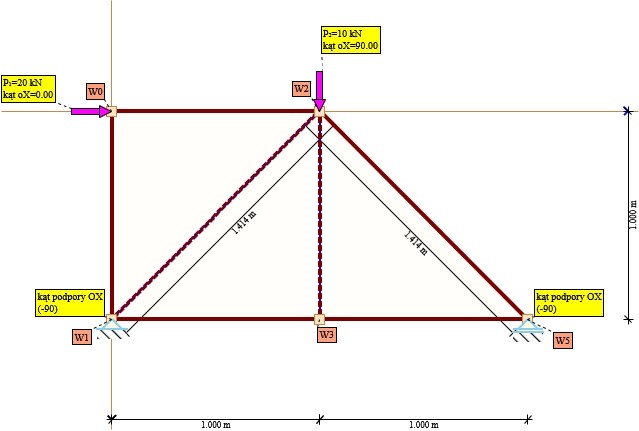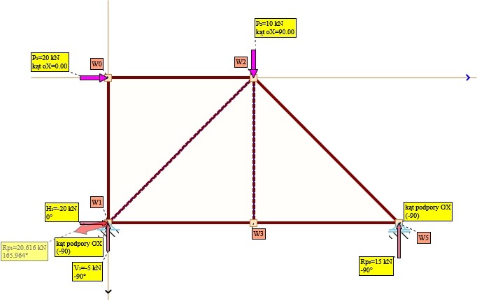 Zadanie: Dla kratownicy statycznie wyznaczalnej obliczyć reakcje podporowe i wyznaczyć metodą równoważenia węzłów siły w prętach.