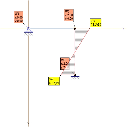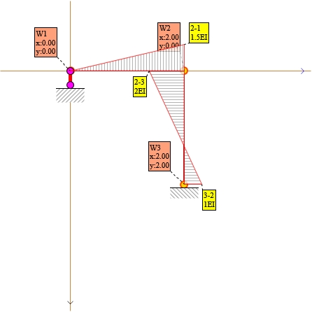Przekształcamy schemat naszego układu na statycznie wyznaczalny poprzez redukcję nadliczbowych więzów. W miejscach usuniętych nadliczbowych przykładamy kolejno obciążenia jednostkowe i wyznaczamy momenty zginające.