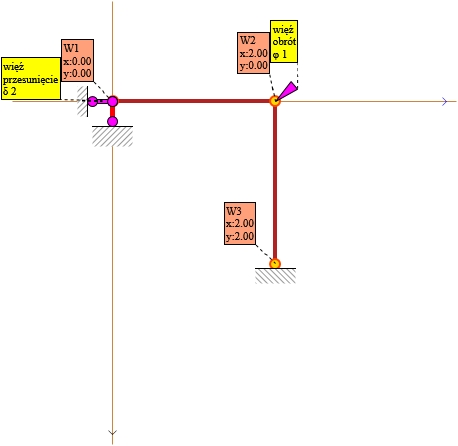 - Węzeł 2: x = 2.000 m, y = 0.000 m