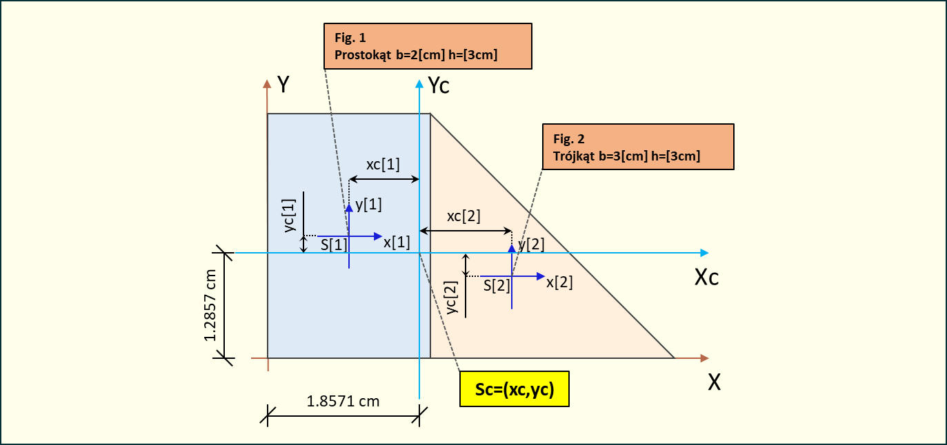 Mając wszystkie potrzebne dane możemy zatem obliczyć odległości między środkami ciężkości poszczególnych figur a środkiem ciężkości całego układu: