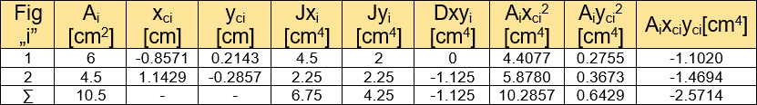 Tab. 2. Zestawienie danych do obliczenia centralnych momentów bezwładności