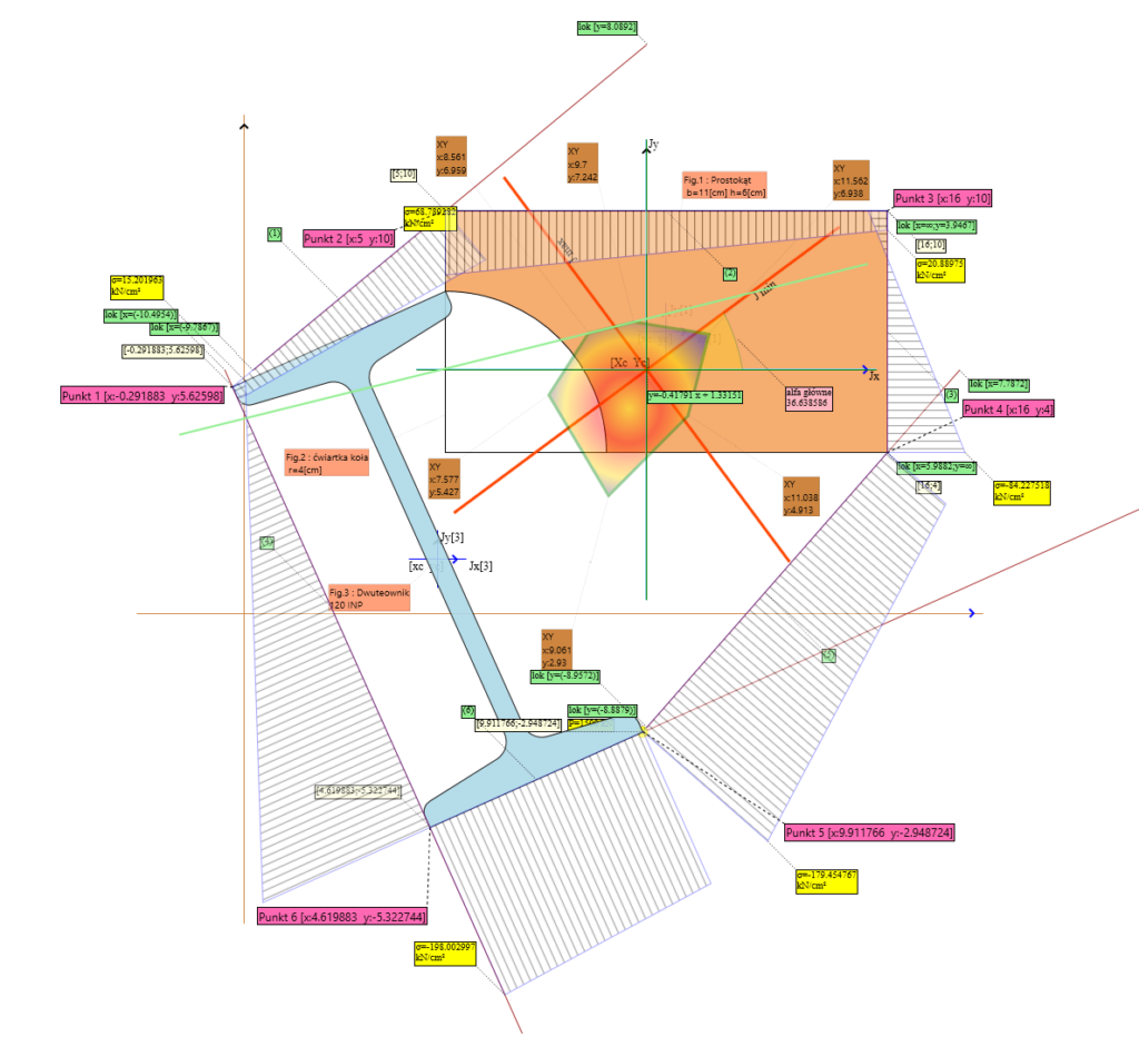 Obliczenia naprężeń wykonamy na podstawie przykładu nr 2 (cały przykład możesz zobaczyć – tutaj).